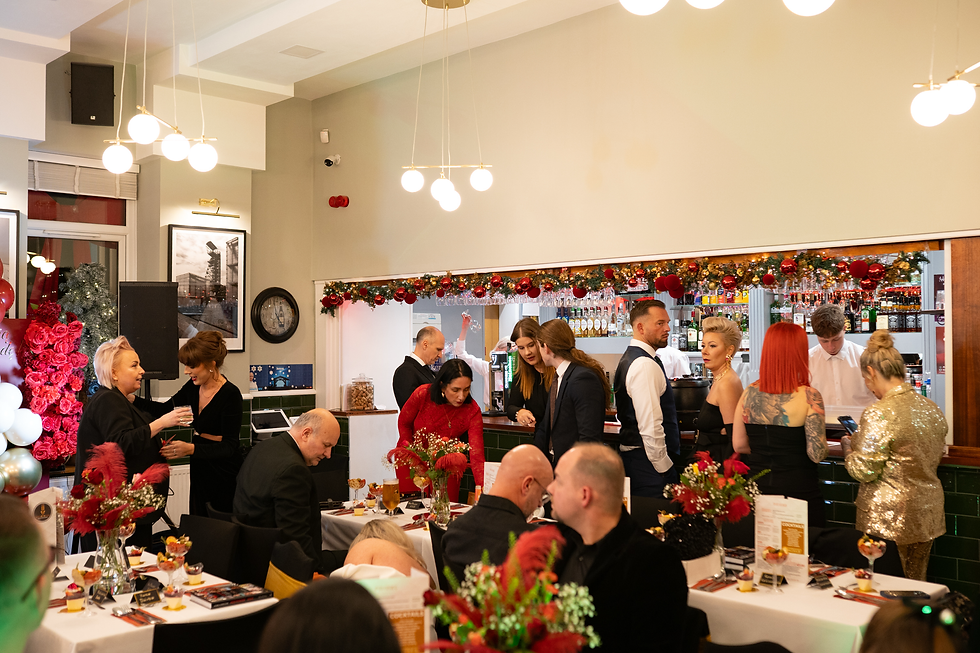 Sala restauracji Bread & Wine zachwycała elegancką dekoracją, przepiękną balonową ścianką - wykonaną przez Justynę Waśko i subtelnym świątecznym wystrojem. Wieczór wypełniły piękne wieczorowe suknie wszystkich pań, stylowe garnitury panów oraz atmosfera dumy i wzruszeń. Już od pierwszych chwil, gości witały dźwięki wiolonczeli w wykonaniu Bena, które wprowadziły wszystkich w wyjątkowy, uroczysty nastrój.